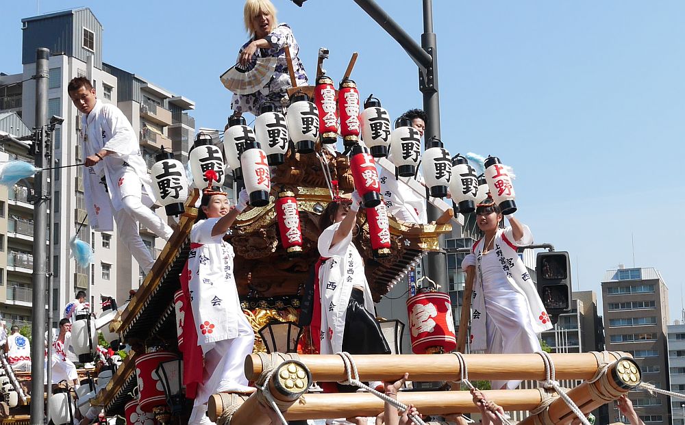 地車の前では女性3人がお囃子に合わせて提灯を上げたり下げたり。