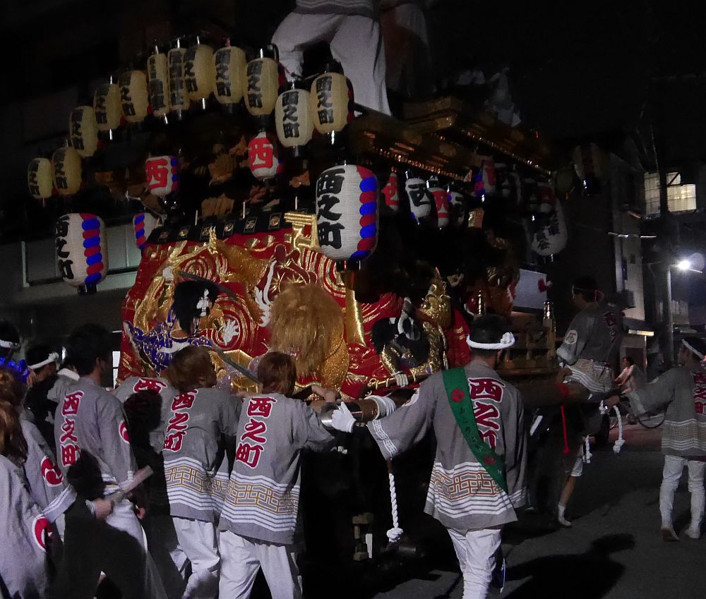 午後8時20分過ぎ、野里のメインストリートへ向かって曳行中の西之町地車