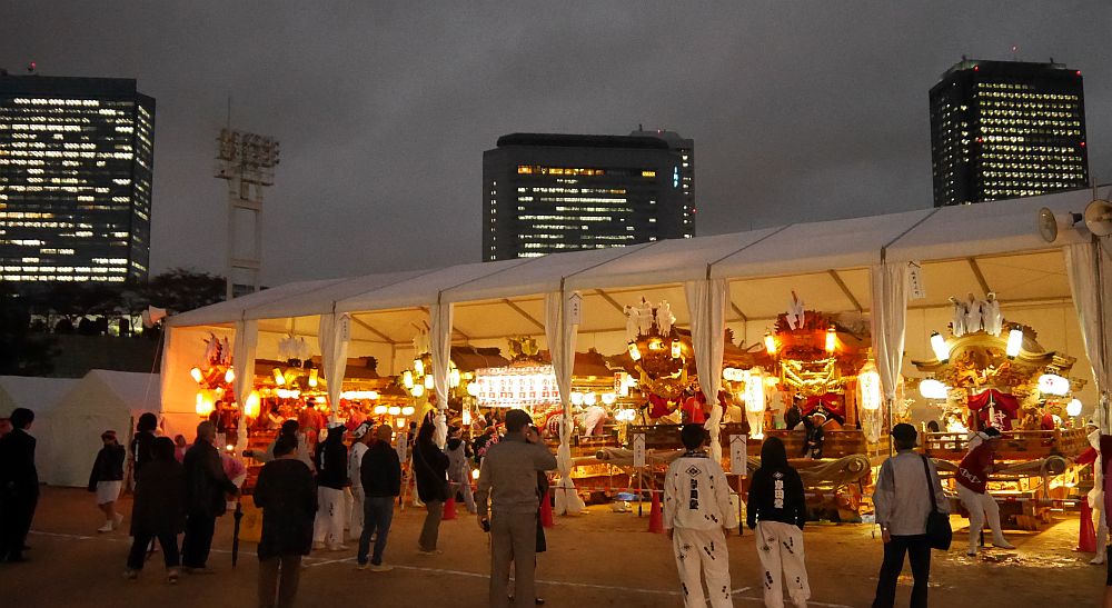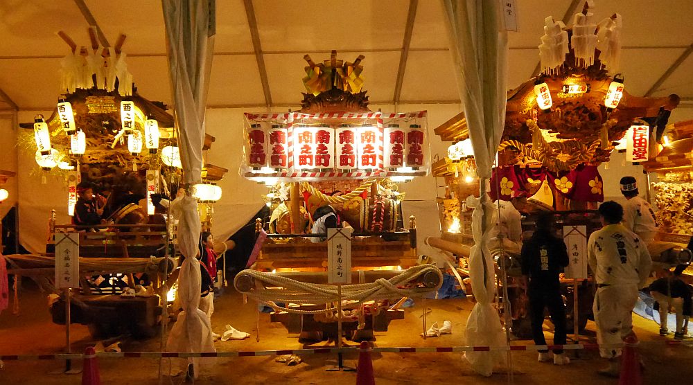 14台の地車はメインステージを挟んで左右に7台ずつ並んで据え置かれています。