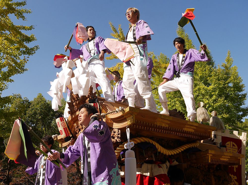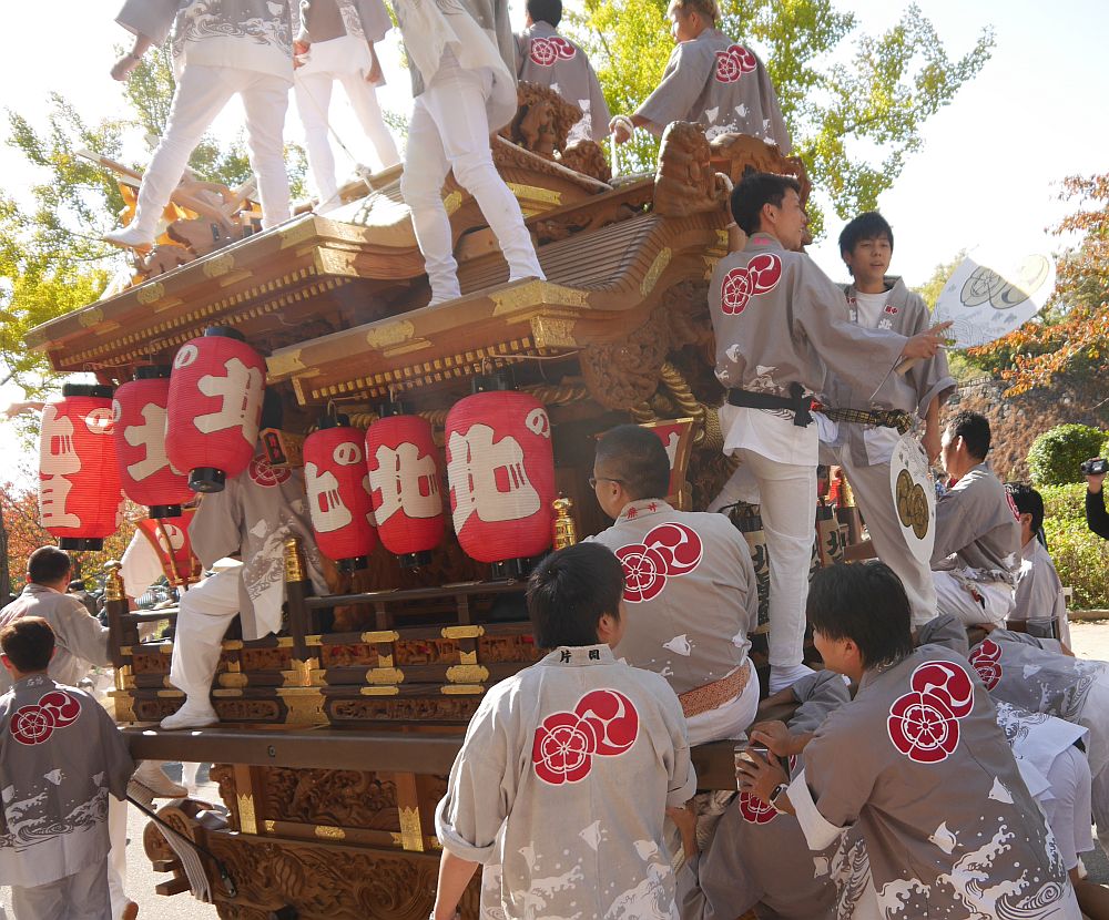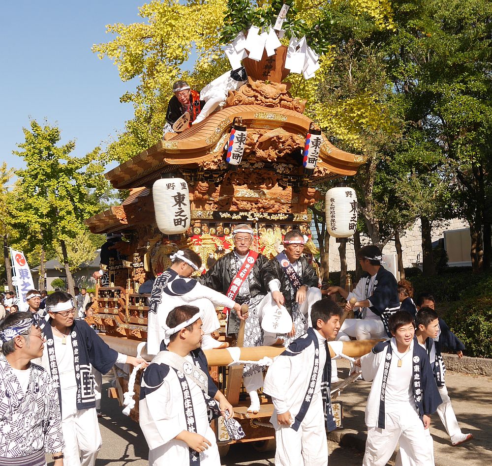 並んでいる地車列を撮影していると、先頭の野里東之町が手打ちしています。