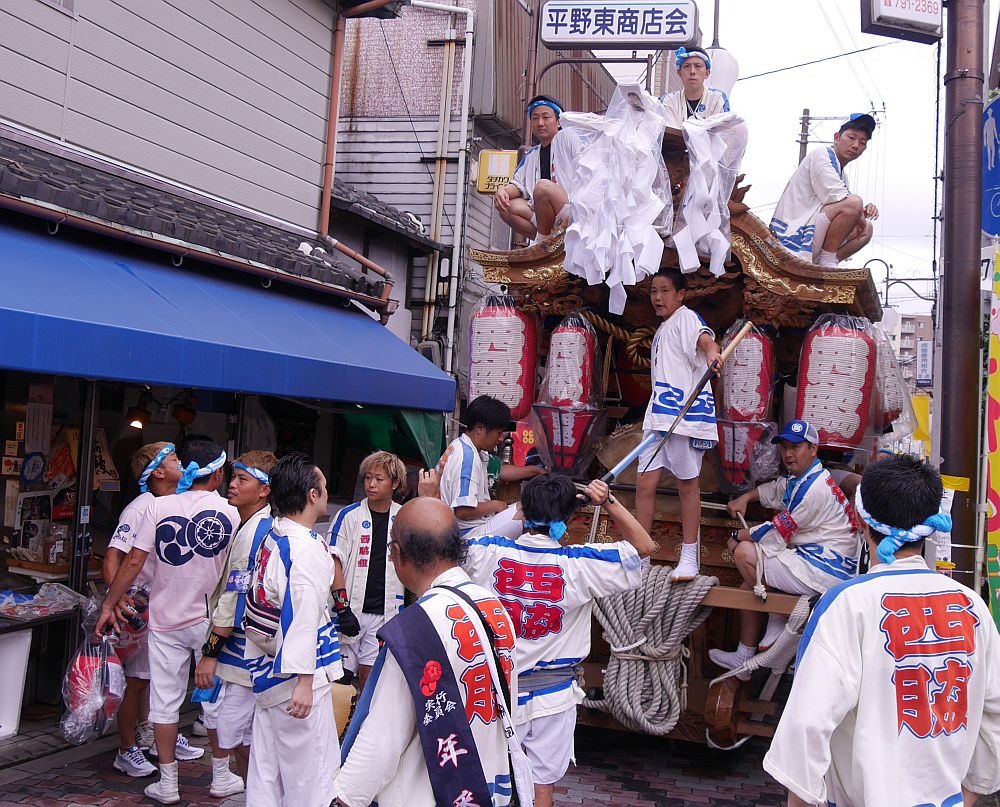 正午過ぎ、西脇組地車の姿が商店街の東向こうに見えてきました。
