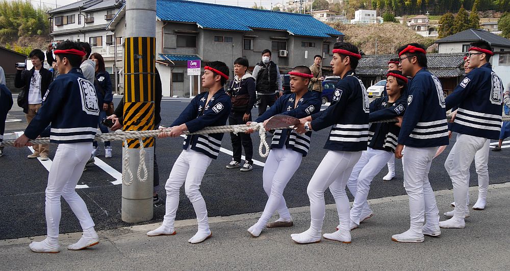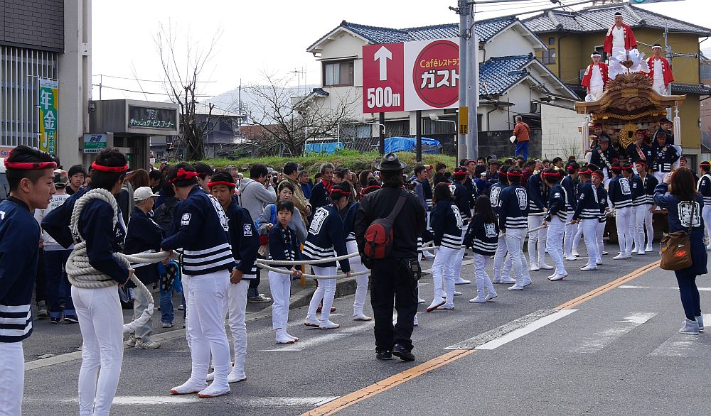 先ほど下った急勾配の坂道を登る三日市北部地車。
