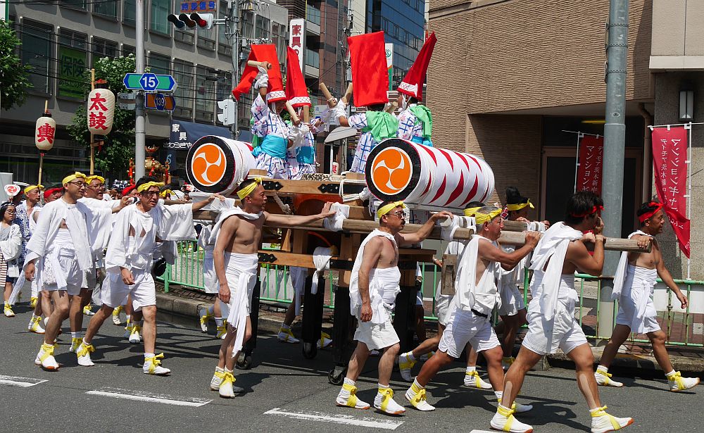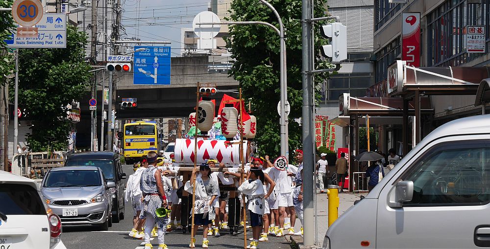 枕太鼓が太鼓の音を響かせながら交差点を左折