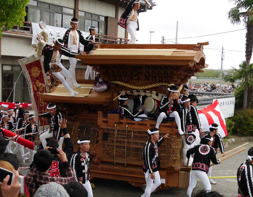 平成28年4月17日、岸和田市の久米田池世界灌漑施設遺産登録記念曳行を 見に行ってきました。 久米田池世界灌漑施設遺産登録記念曳行として久米田寺への行基参りを行なった 久米田池近隣地区の地車が午前10時20分頃から順次久米田寺を出発していきました。 ここでは久米田寺出発後半 西大路、小松里、額町、額原、大町、池尻 の出発画像を 紹介します。 では、岸和田市の久米田池世界灌漑施設遺産登録記念曳行画像その3をご覧下さい。