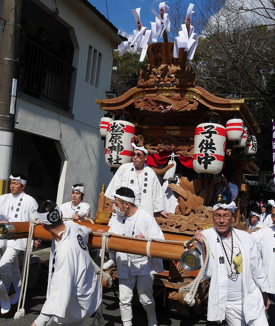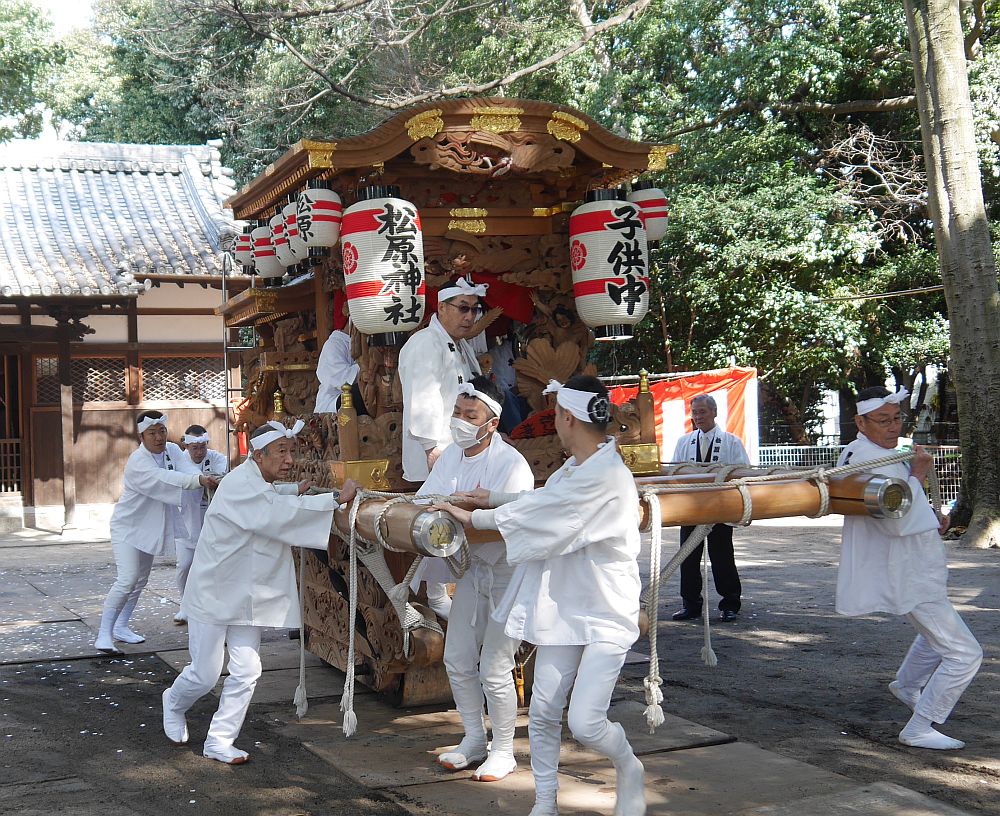鳥居をくぐり抜け、神社から宮出した松原神社地車