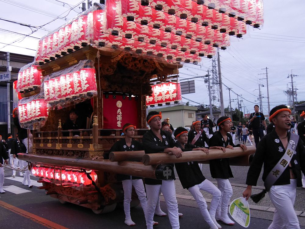 休憩中の三日市南部地車の前を進みます。