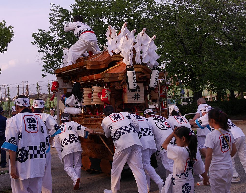 ここでは、夜のパレードの出発地点である大枝公園入っていく7台の地車の様子と