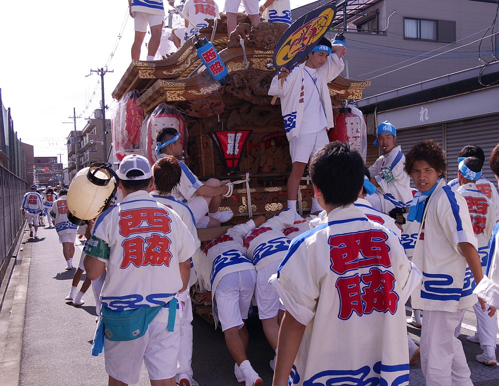 午後3時半、まだまだ厳しい陽射しを正面から浴びながら進む西脇組地車