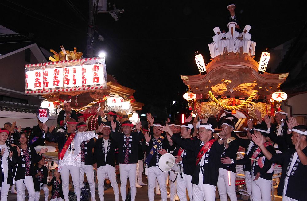 鉦太鼓が一斉に打ち鳴らされ、5町地車が頭を下げてます。