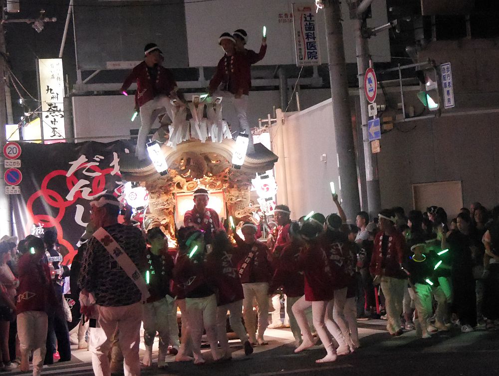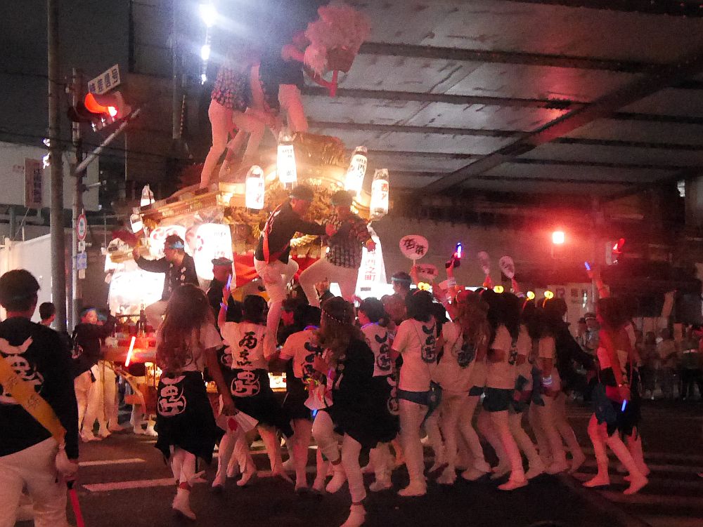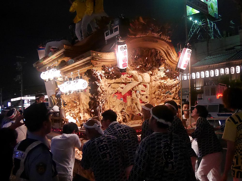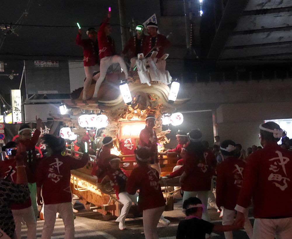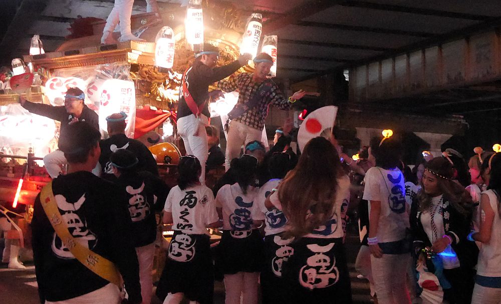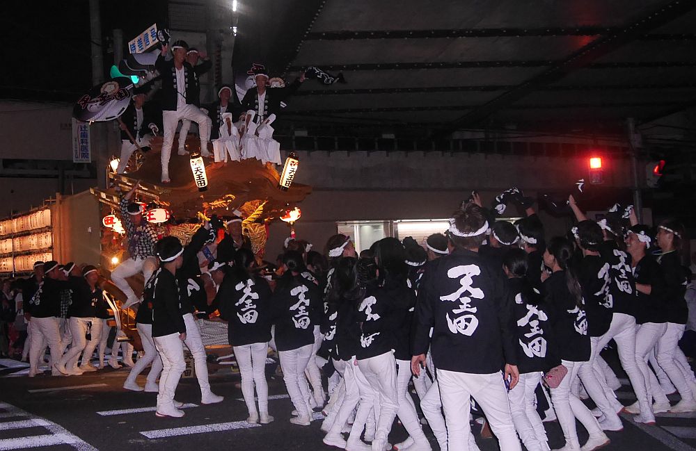 地車の前ではたくさんの若い子達がタオルを振り回しています。
