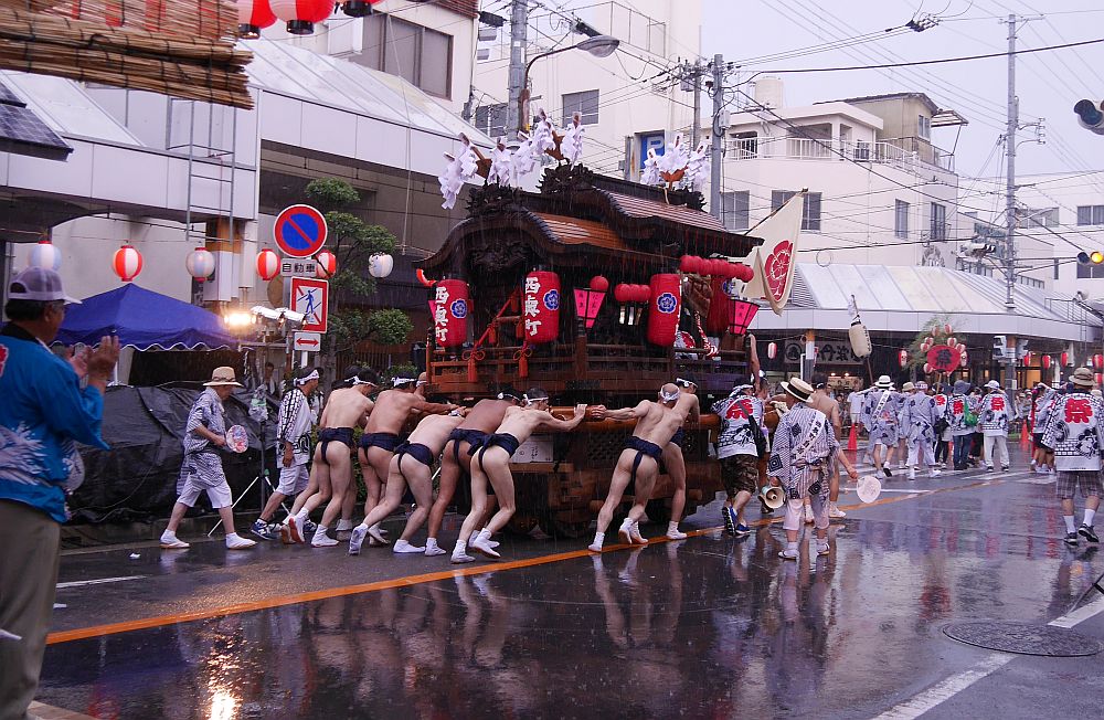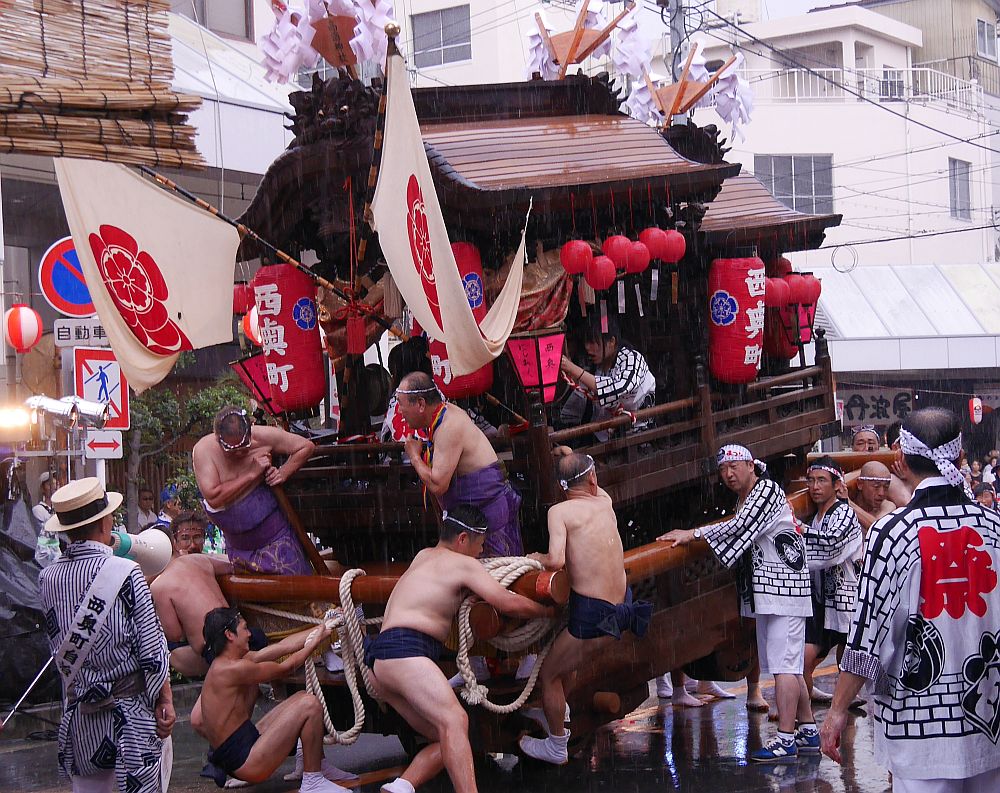 お囃子が始まり、地車の後ろを担ぎ上げて