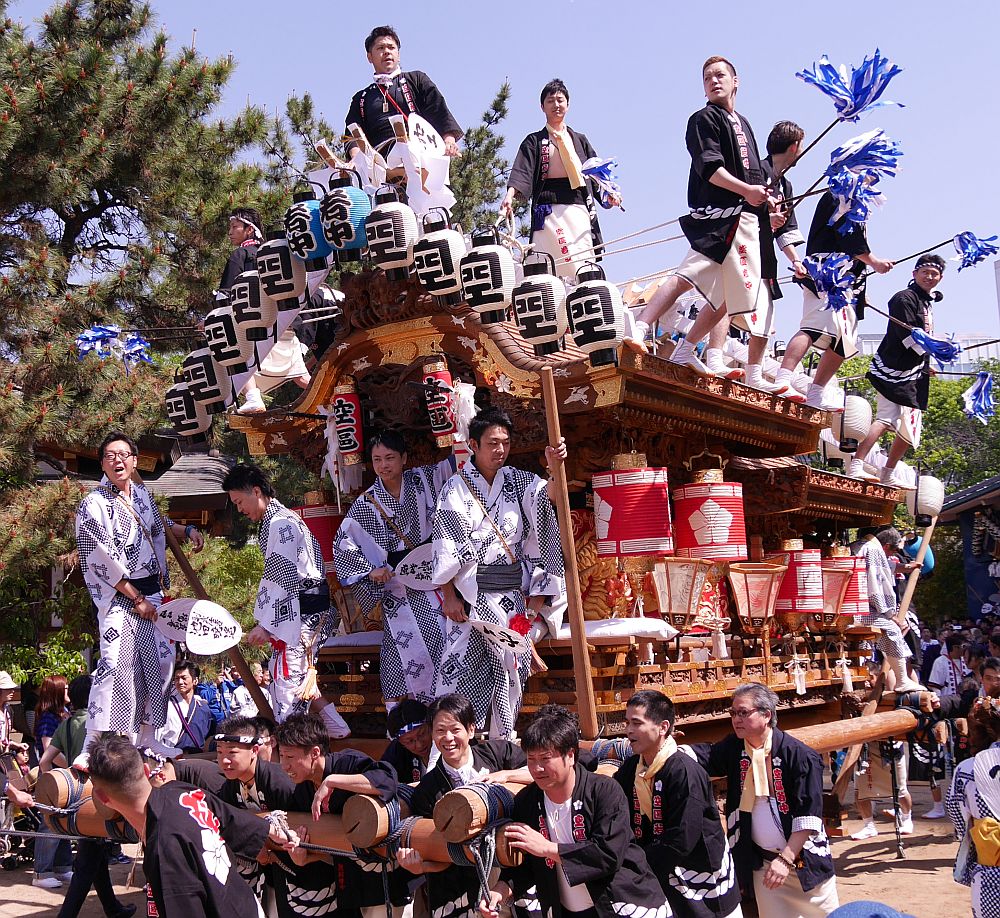 山田区の役員さん、胴上げされて、そのまま担がれて地車の前に座りました。