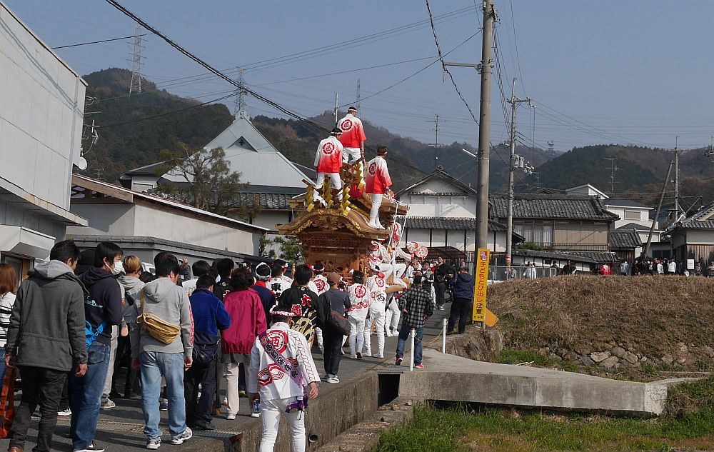 科長神社近くの村の中の道を進む西町地車