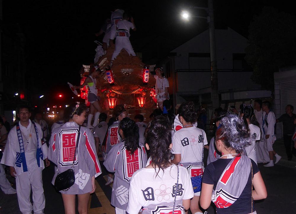 午後9時40分過ぎ、田嶋神社前で練り回す地車が見えてきました。
