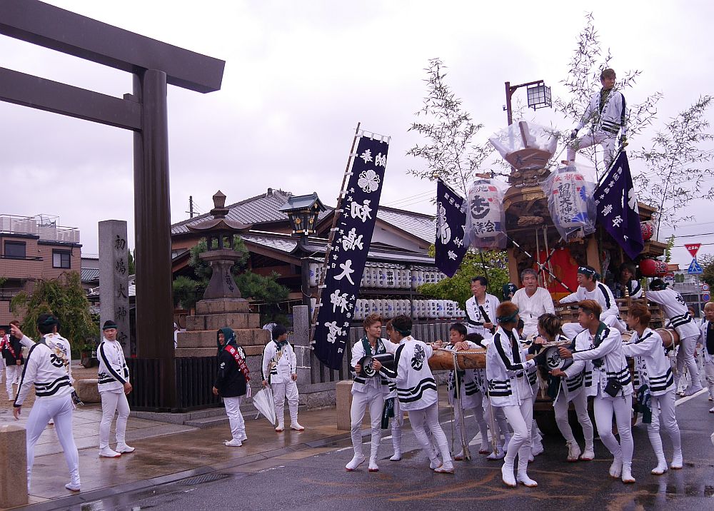 雨の中、神社横まで来ると、地車が普通に曳行しているのが見えてきました。