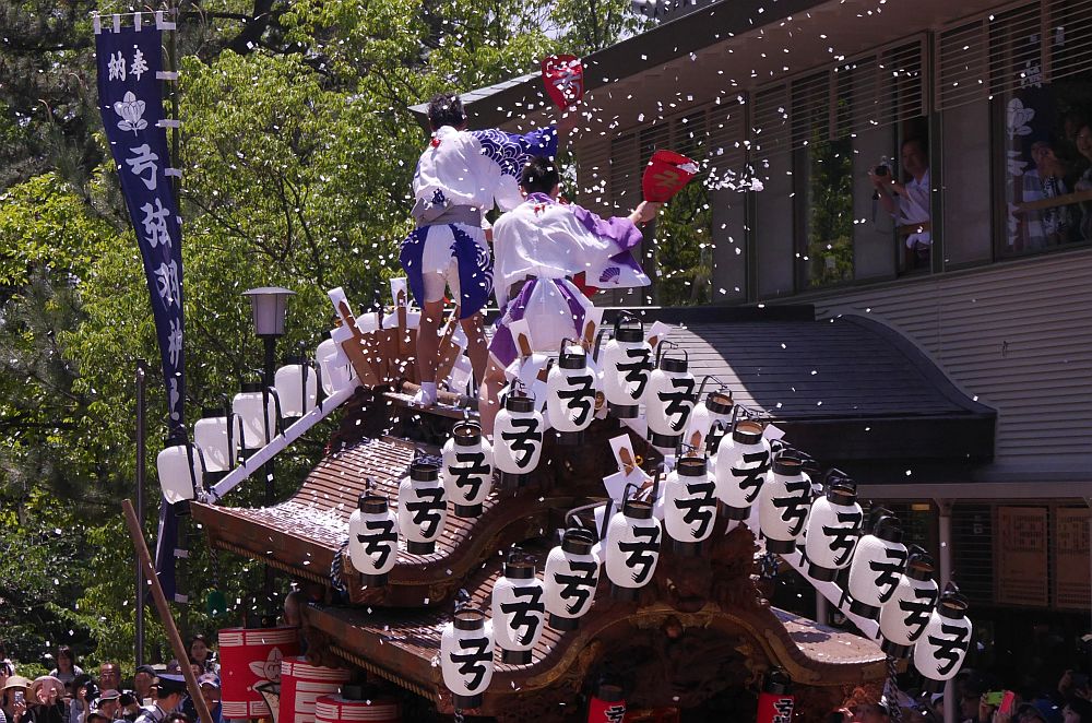 屋根方のウチワから綺麗に紙吹雪が出てきます。