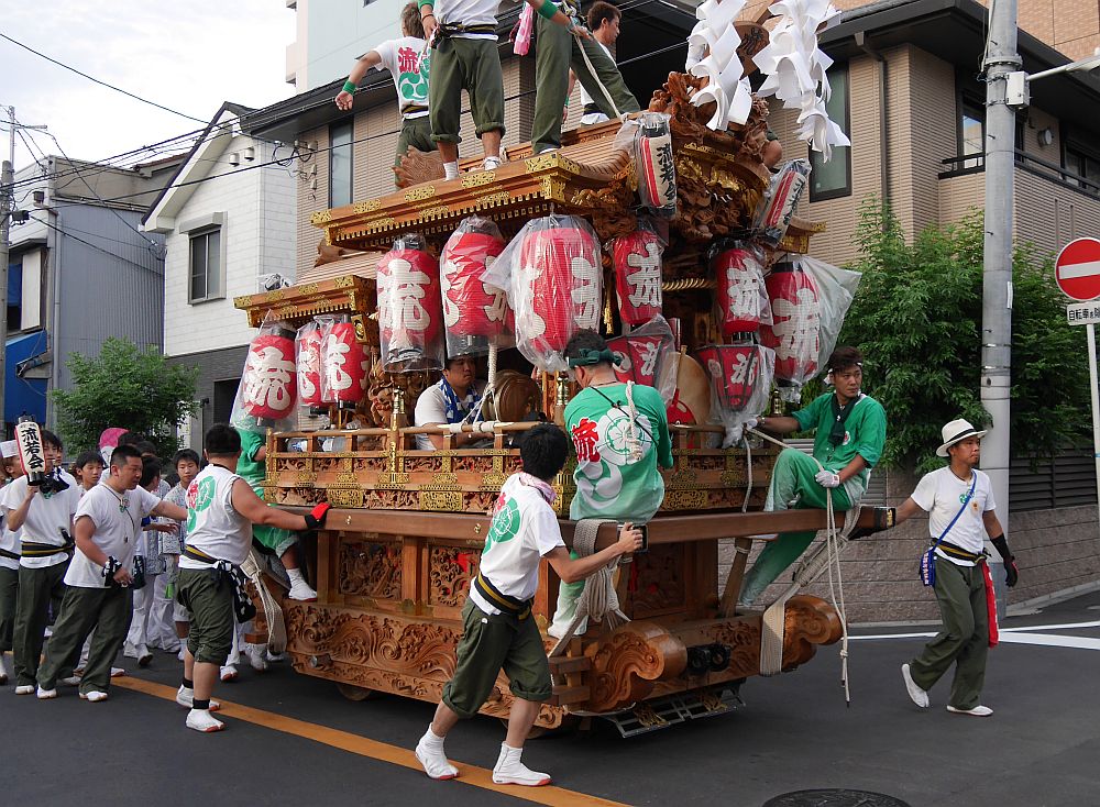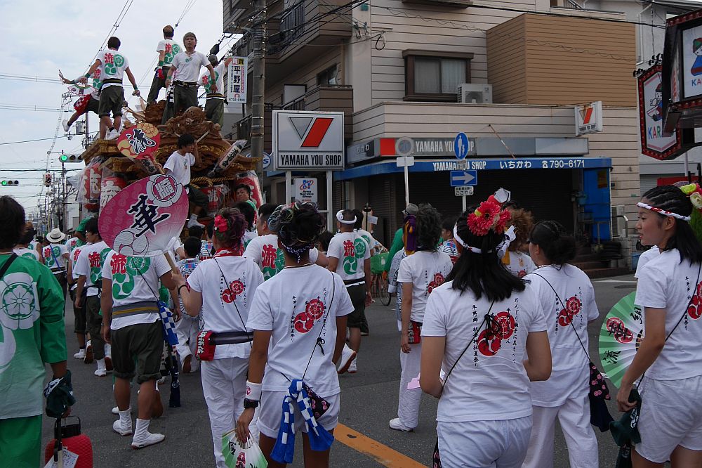 白鷺公園を背に地車の後ろを担ぎ上げてます。