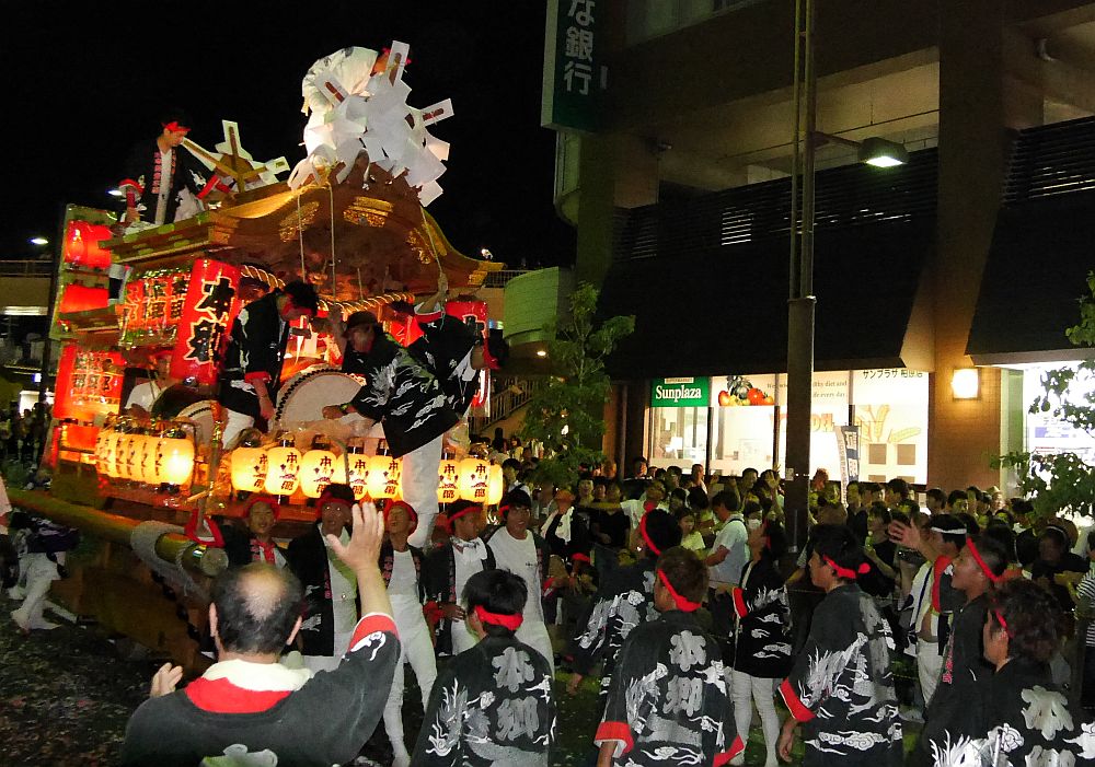 パレードメインストリートの坂道の中腹で、坂を登る地車と坂を下る地車を撮影。
