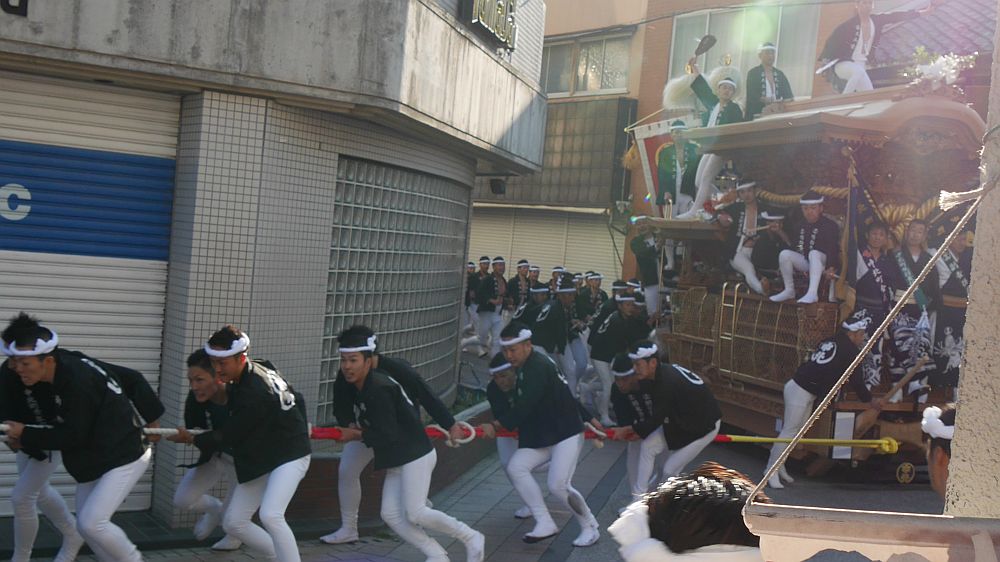疎開道路手前まで出てきている大手町地車の前を