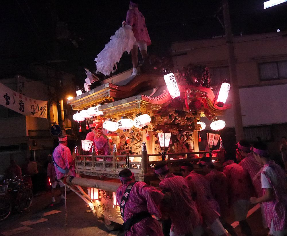 地車の周りで踊る桃色ハッピの皆さん