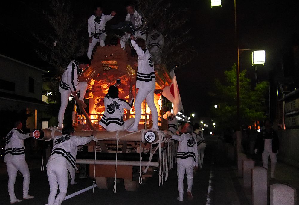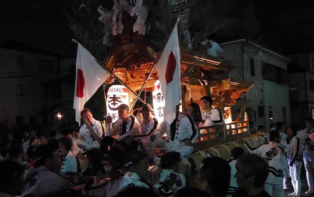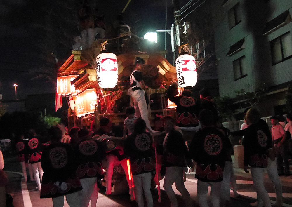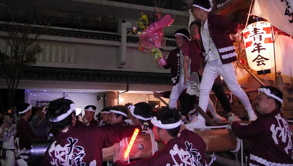 地車の前には花束を抱えたおかあさんが乗っていますね。