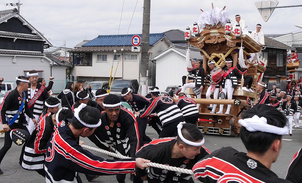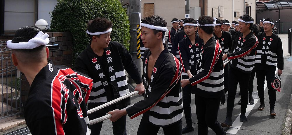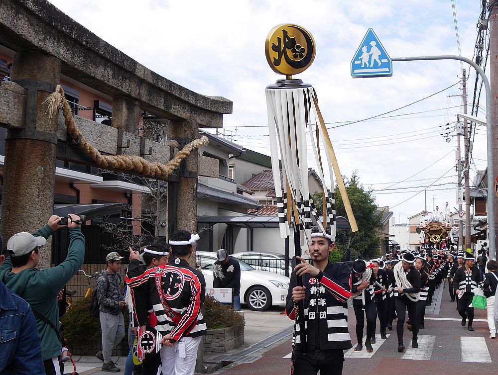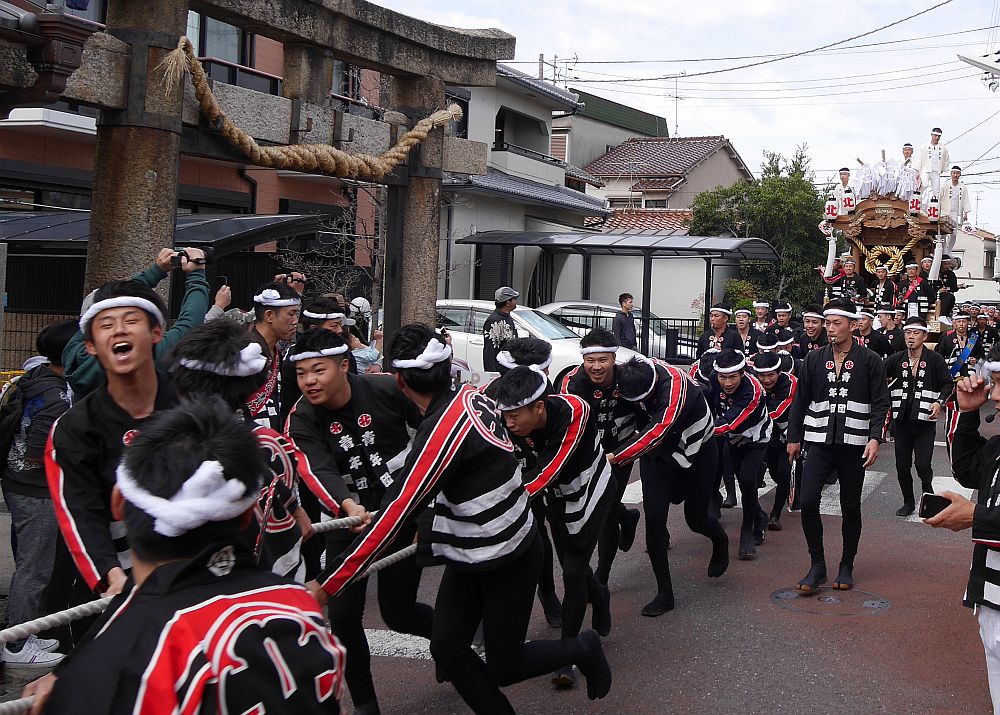 東高野街道沿いの鳥居前を進む古市北町の綱先