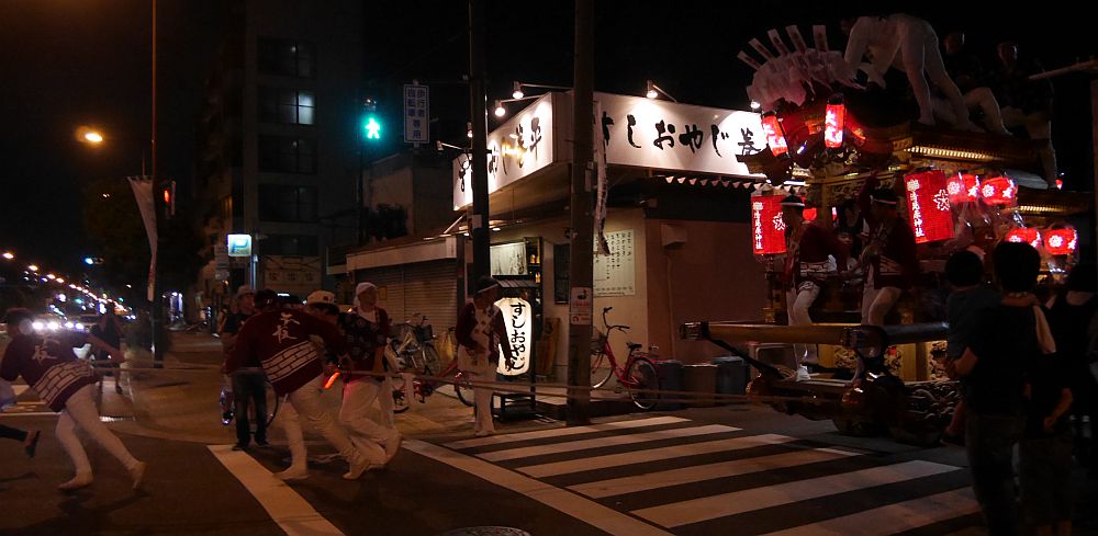 道中囃子で交差点に走り込んでくる大友地車