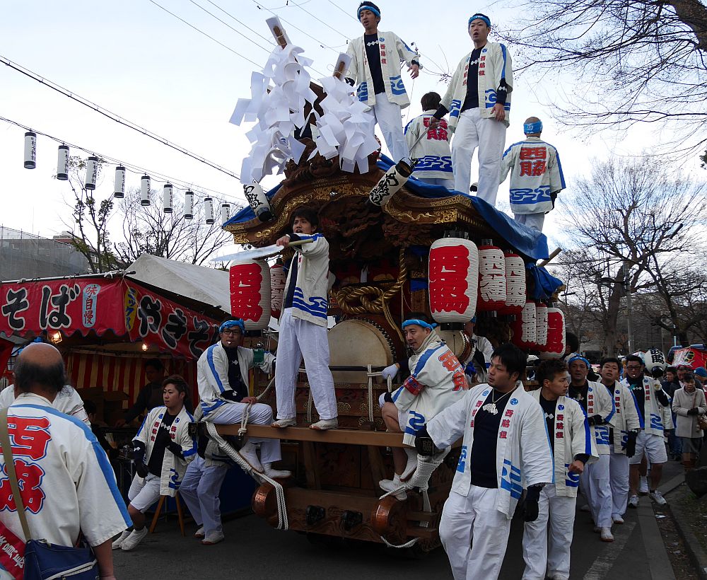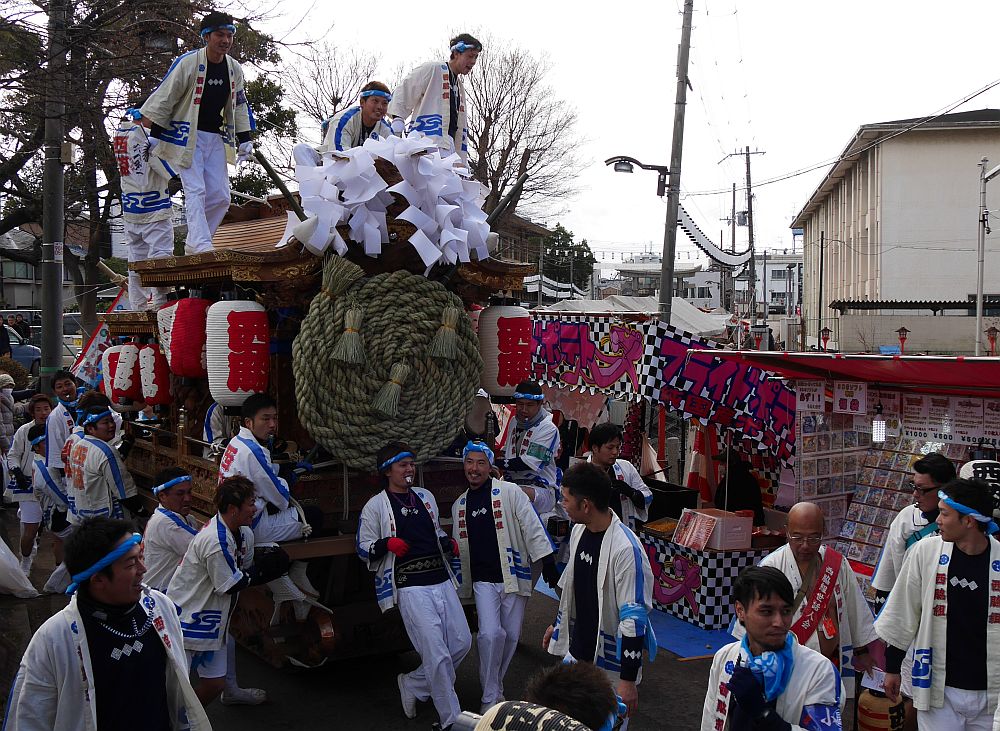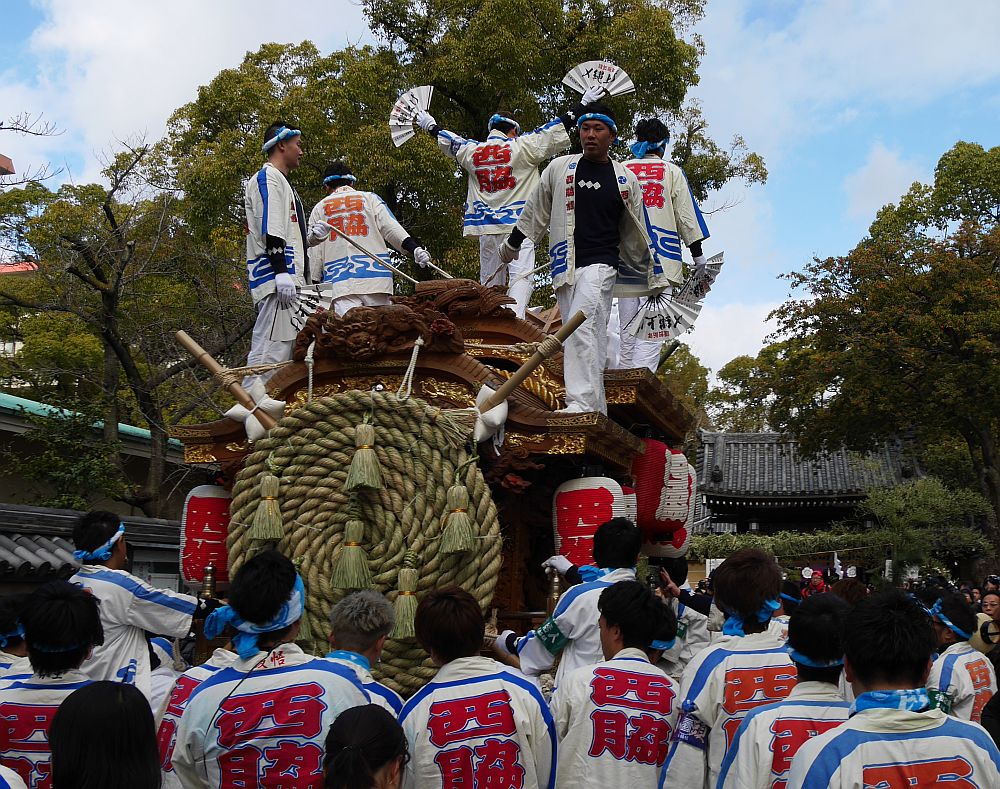 参道途中の鳥居を出たところで180度方向転換した西脇組地車が