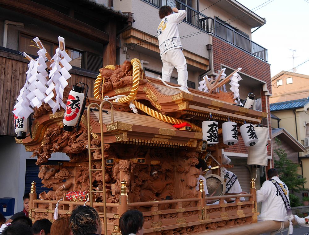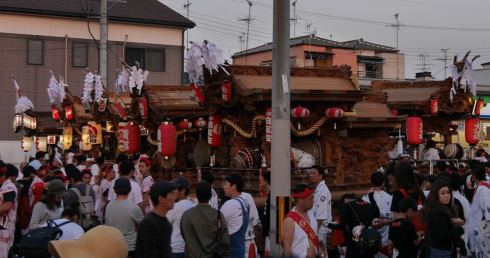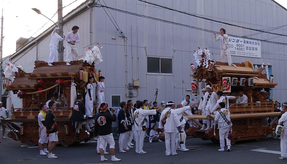 左側に並ぶ5台と正面で向かい合う2台の地車