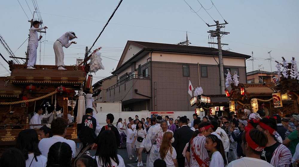 駐車場左側に並ぶ5台の地車の前に到着した長瀬南大蓮