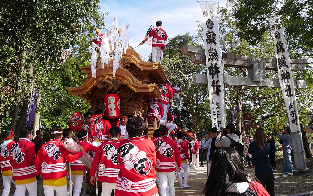 鳥居横を通って錦織神社参道へと入っていく甲田地車