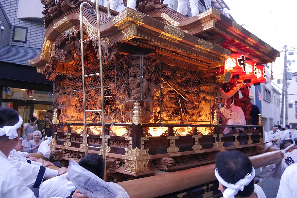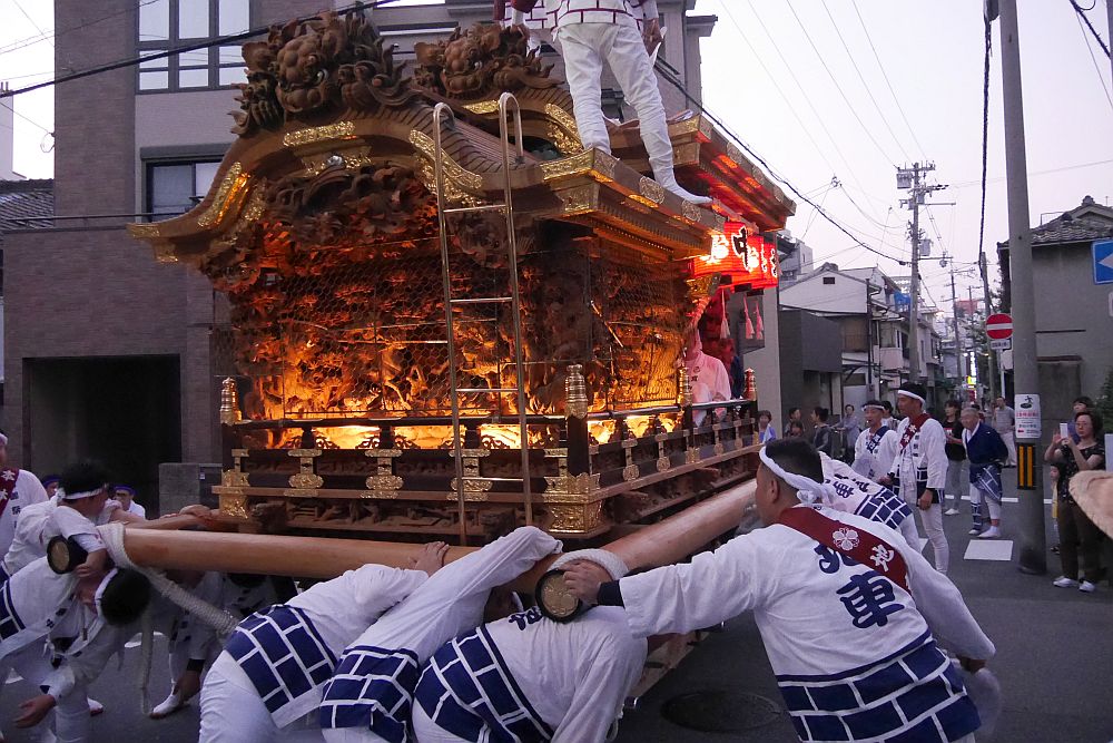 地車の四隅に肩を入れて廻します。