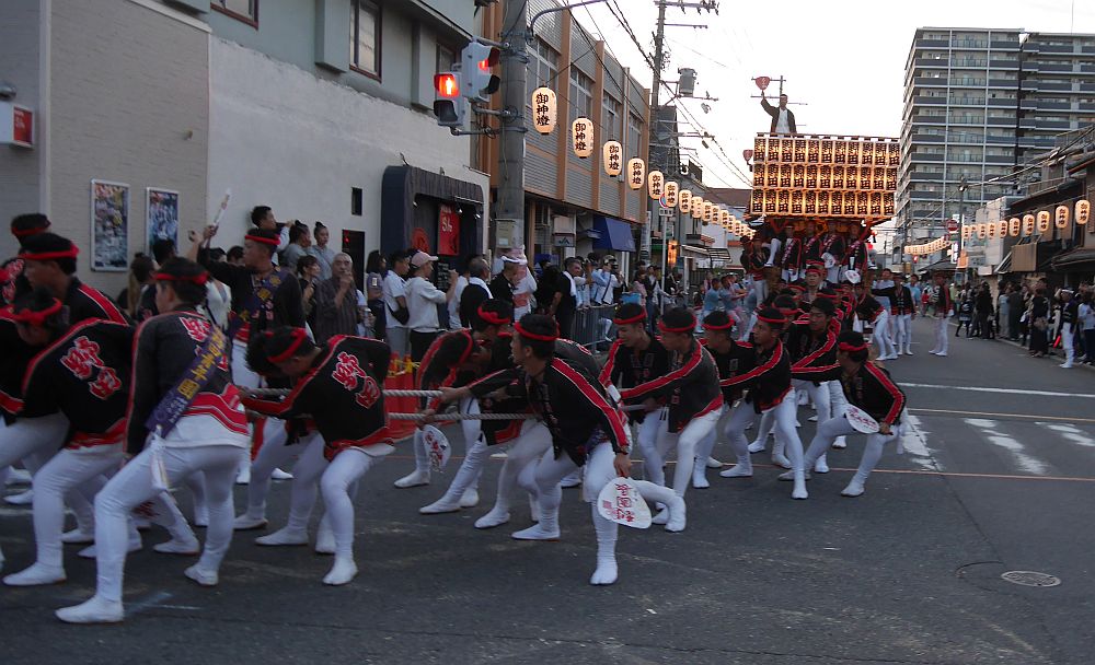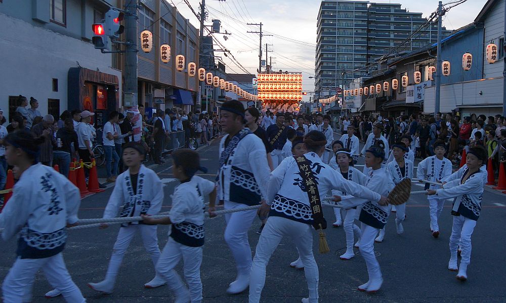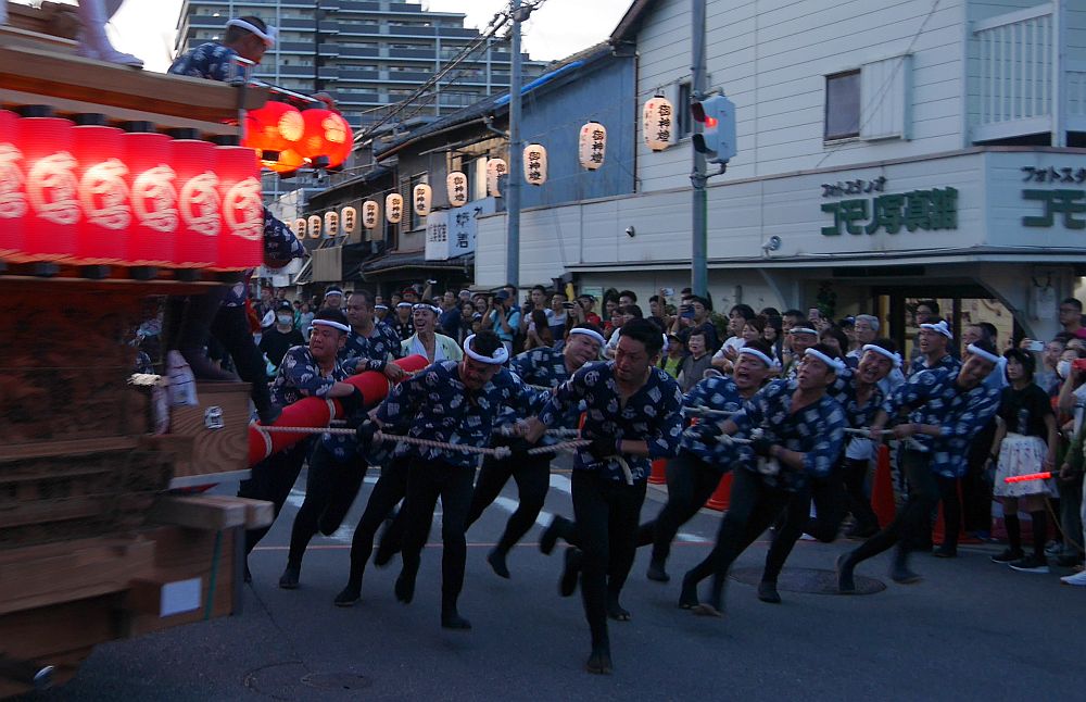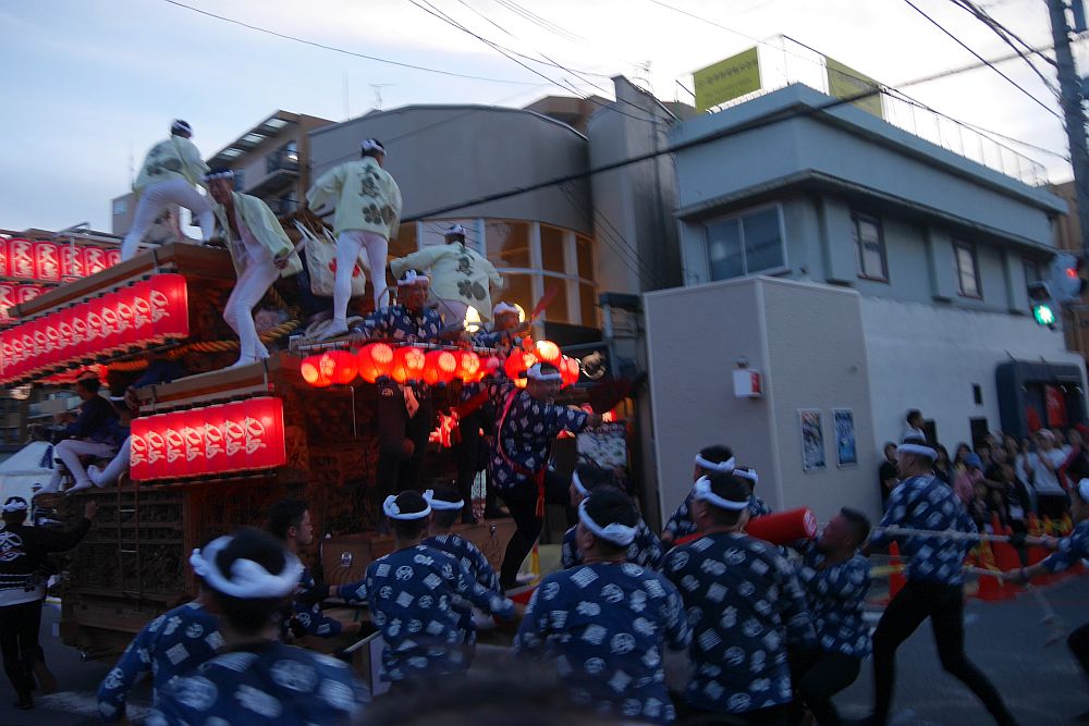 平成30年10月5日、堺市の鳳地区宵宮連合曳き大社前を見に行ってきました。 金曜日から3日間行われる鳳地区の祭礼、その初日宵宮の夕方の連合曳きを見に行ってきました。 初日の連合曳き、新在家・野田地区乗り入れが終わった後、国道26号線を横断 した地車列は大鳥大社前へ向かって東進し、大鳥大社前交差点を右折します。 この時、やりまわしをする地車もあると聞き、大社前で待ってました。 では、遅くなりましたが、堺市の鳳地区宵宮連合曳き大社前画像その1をご覧下さい。