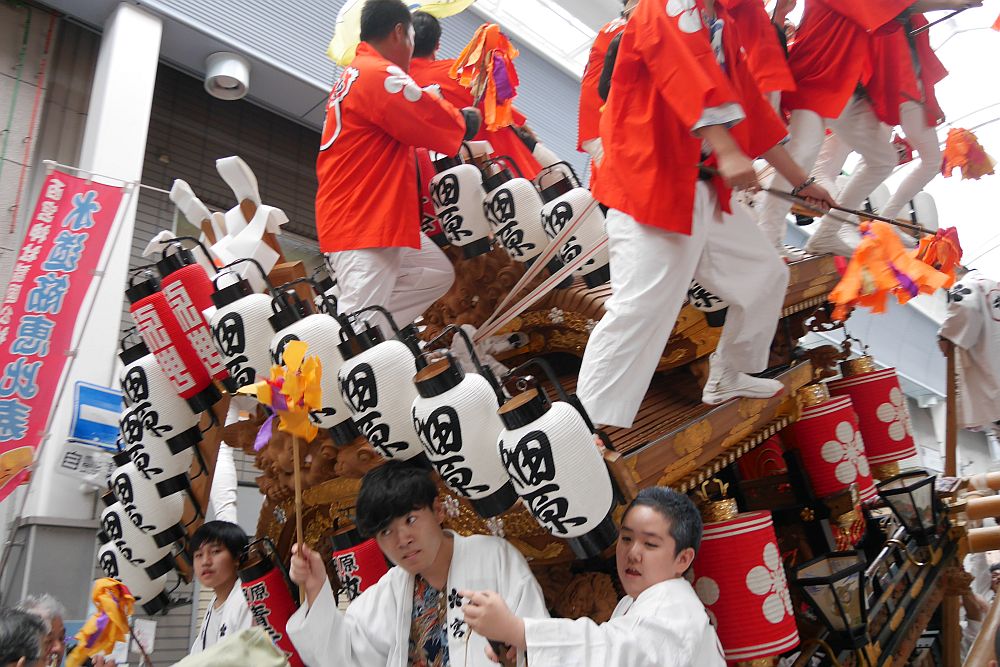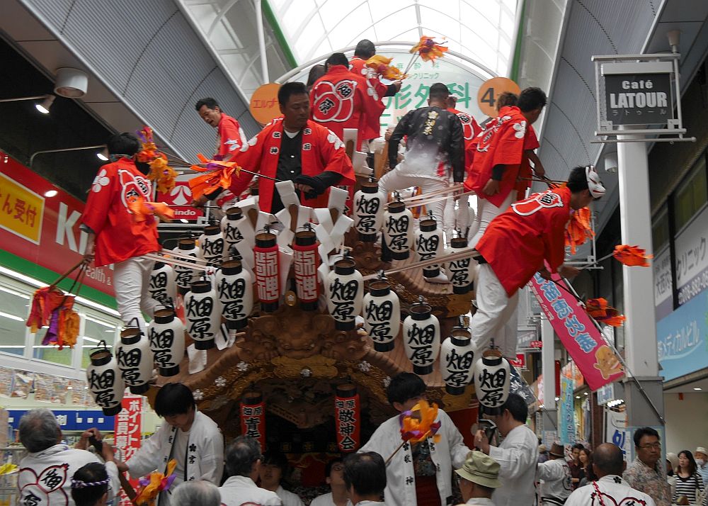水道筋商店街を前を担ぎ上げながら進む畑原地車