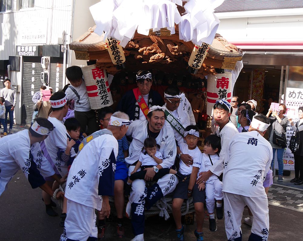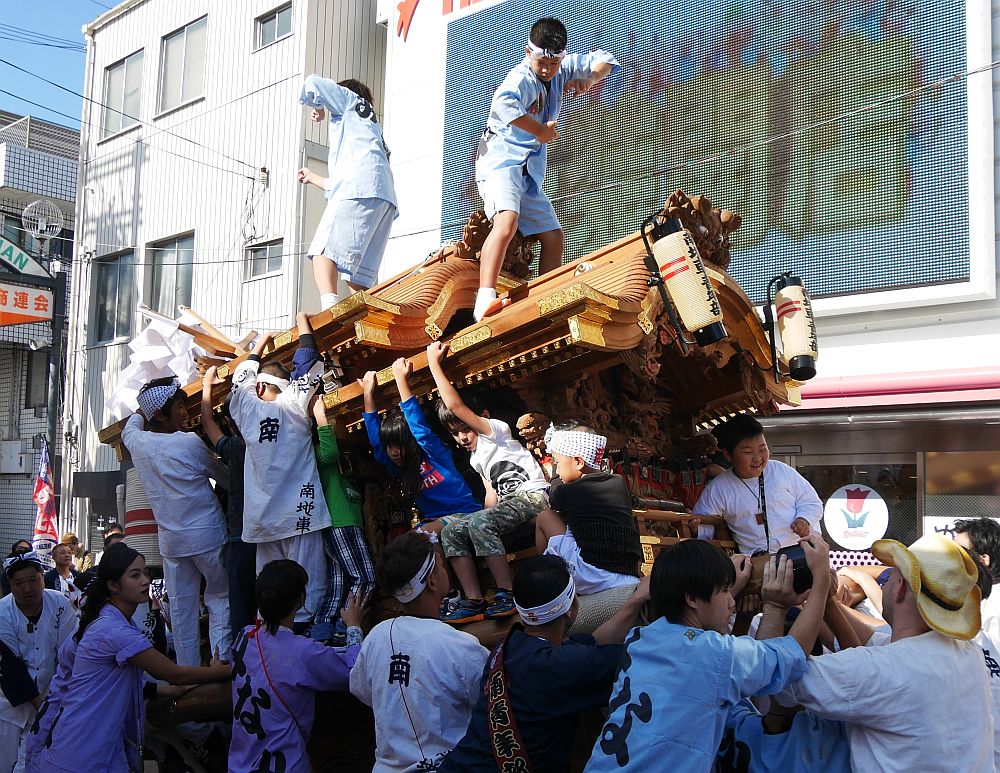 地車にしがみつく子供たちを