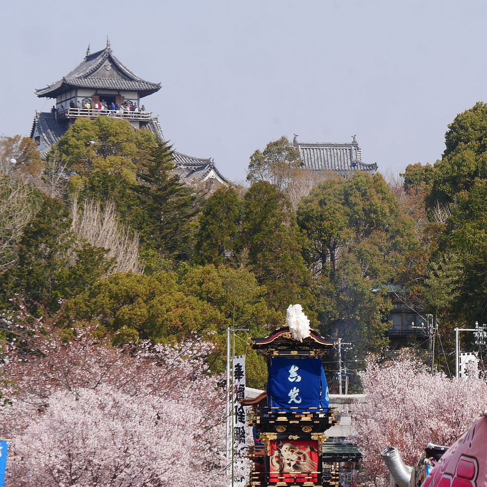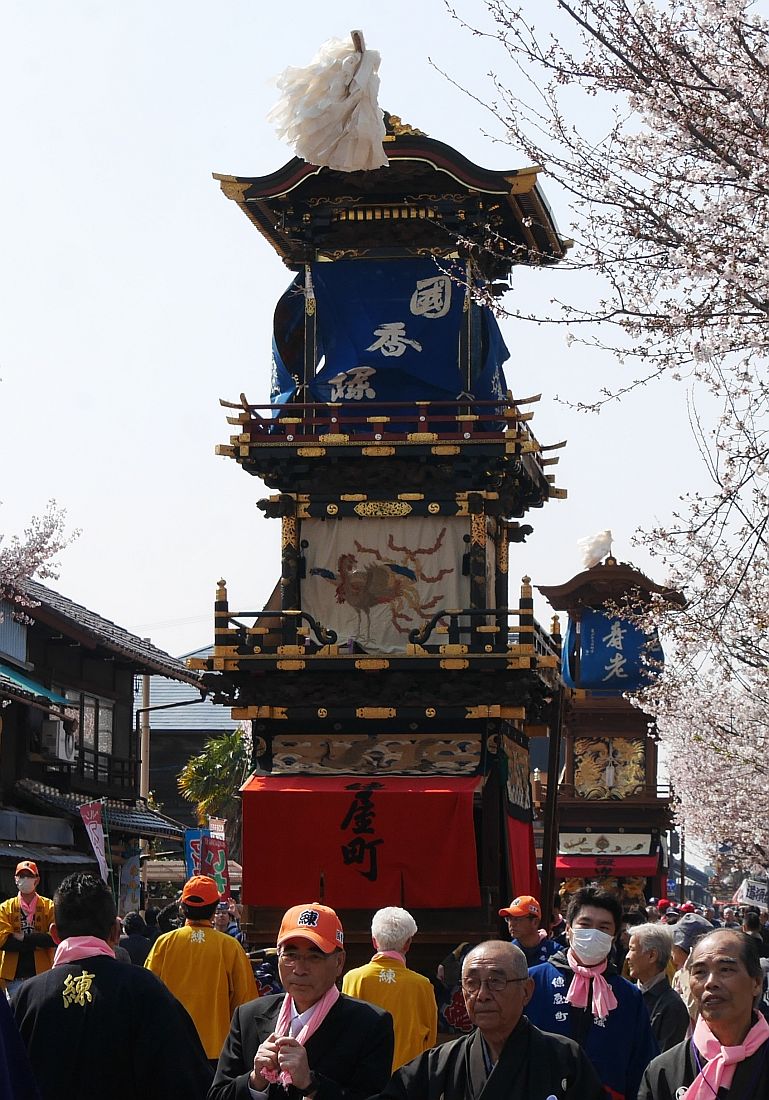 この日は真っ青な空の下を行く山車と満開の桜、そして背後にそびえる