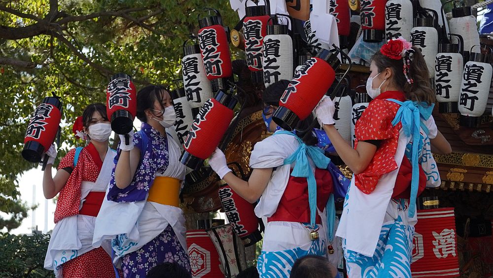 お囃子に合わせて提灯を振る女の子たち。